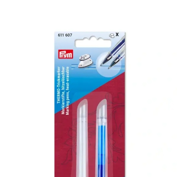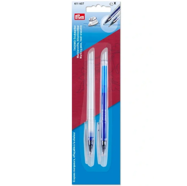 Šivanje, tapiserija, patchwork, prošivanje, aplikacije. Bez obzira na tehniku koju koristite, a koja zahtijeva vidljive, ali privremene oznake na tkanini, Prym THERMO trik markeri su zgodno rješenje. Ove toplinski brisive olovke za označavanje stvaraju fine linije na širokom rasponu tekstila. Idealne su za rad sa predlošcima koji zahtijevaju vrlo precizne crteže. Ovaj Prymov set sadrži dvije toplinski brisive olovke za označavanje, jednu s bijelom bojom i jednu s plavom bojom, kako biste dobili jasno vidljive oznake na svijetlim i tamnim tkaninama. Kako da se riješim oznaka olovkom na tkanini? Glačalo je sve što vam treba: jednostavno glačajte bez pare kako biste lako uklonili crte napravljene vašom toplinski brisivom olovkom za tkaninu. Samo odaberite pravu temperaturu za vrstu tkanine i koristite krpu za glačanje ako koristite osjetljivu tkaninu. Oznake će nestati poput magije. Sve pogreške koje napravite tijekom označavanja mogu se brzo ukloniti pomoću integrirane gume. Alternativno, tkaninu možete prati u perilici ili ručno. Neki korisni savjeti: Držite olovku za označavanje okomito s poklopcem okrenutim prema dolje kako se ne bi osušila. Prije nego što počnete raditi, preporučujemo da olovku isprobate na skrivenom području jer svaka tkanina drugačije reagira. Ako se oznake ponovno pojave – što se može dogoditi na temperaturama ispod 0 °C – jednostavno ih ponovno glačajte kako biste ih uklonili.